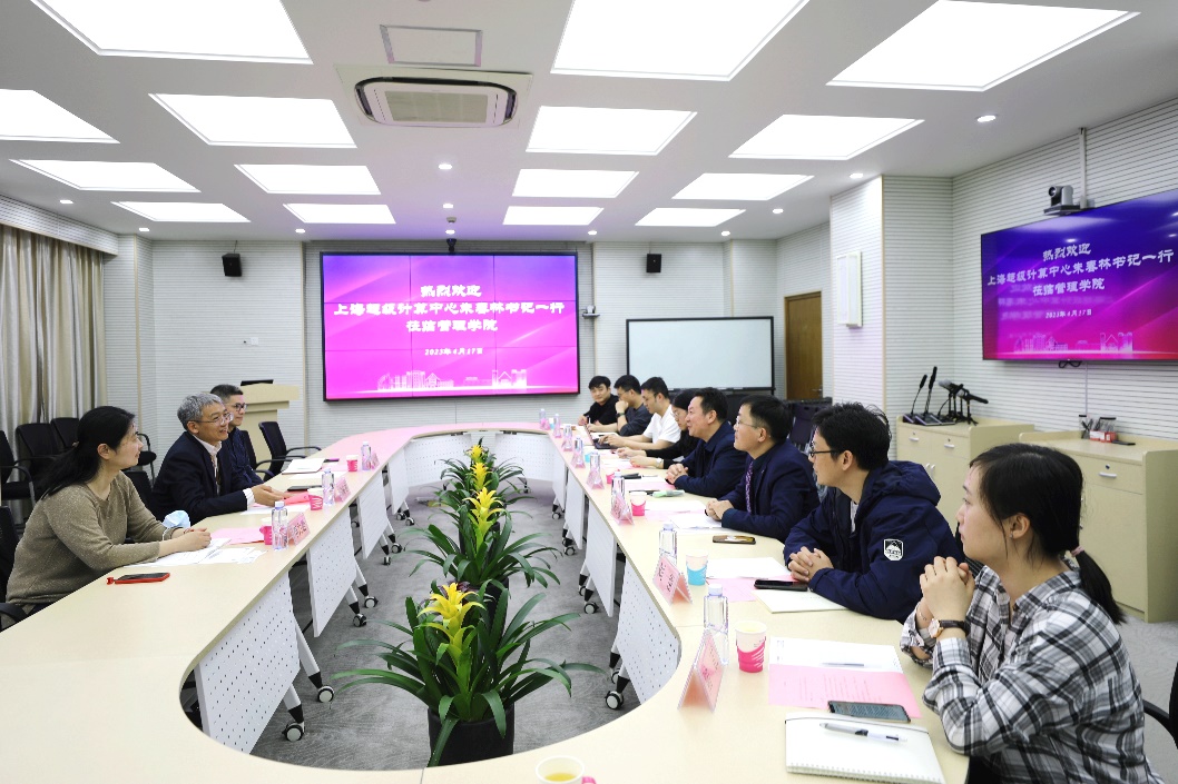 In the afternoon of April 17, Zhu Chunlin, Secretary of Party General Branch of Shanghai Supercomputing Center, Li Lijing, Director of Human Resources Department, and Guo Peqing, Vice Director of Artificial Intelligence and Big Data Department, visited the Business School. Secretary of Party Committee of Business School Ma Jingbo received Zhu Chunlin and his delegation and held a discussion and exchange. Zhu Xiaodong, Secretary of the Party Branch of the Department of Information Management and Information Systems and Vice President of the Institute of E-Commerce Development, Wang Qujian, full-time organizer of the Party Committee, and representatives of teachers of the Department of Information Management and Information Systems attended the seminar. The meeting was hosted by Zhu Xiaodong.