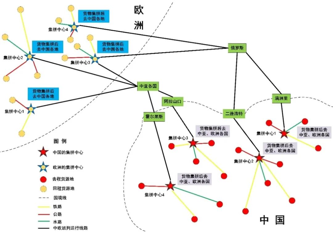 The solution is to improve the load rate of the inbound and outbound of the consolidation centres, determine the range of the centres, and optimise the transportation paths of the networks. Based on the operation data of the CR Express in 2016, our research team demonstrated that the locations of China's consolidation centres should be in Taiyuan, Xi 'a Wuhan, Zhengzhou and Suzhou. Based on the operation data of the CR express in 2018, our research team demonstrated that the locations of European the CR express centres should be in Budapest Titilburg, Duisburg, Hamburg, Warsaw, Lodz, Madrid, Munich, Nuremberg, Pardubice, Schwarzhead, and Zeebrugge.