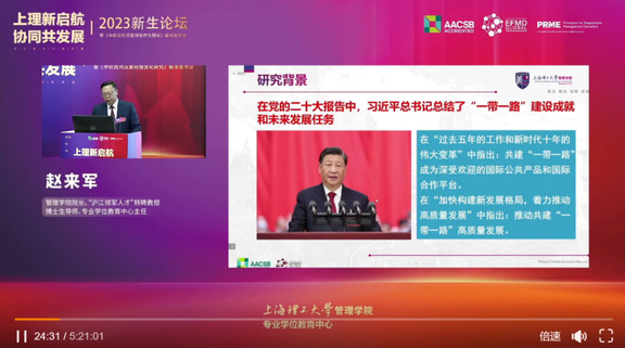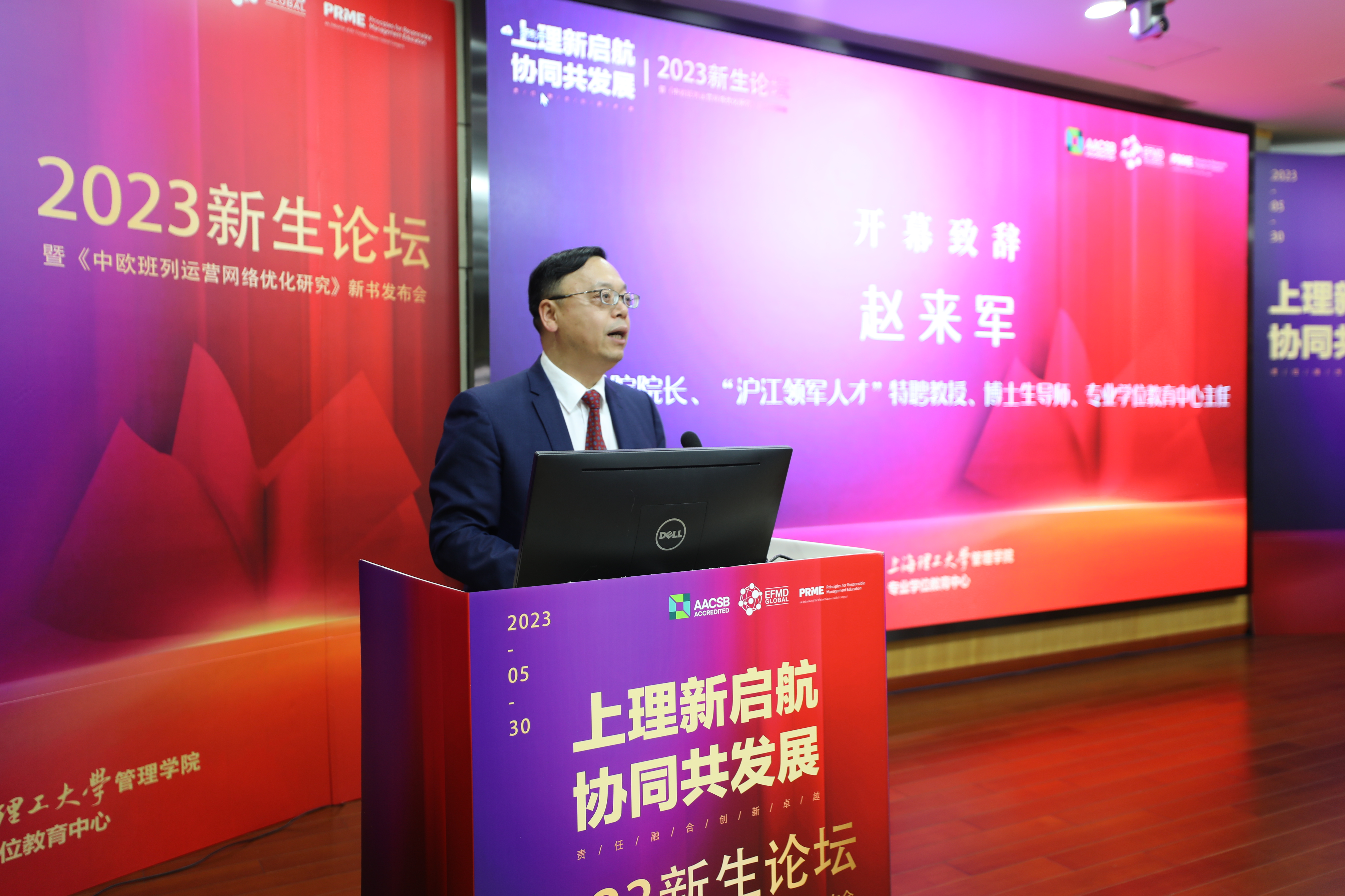 In 2023, the Emerging Forum of "USST New Voyage, Collaborative Development" and the new book conference of Research on Optimization of the China-Europe Railway Express Operational Networks were successfully held in the form of simultaneous live broadcasting online and offline.Zhao Laijun, dean of Business School, distinguished professor of "Hujiang Leading Talents", doctoral supervisor, and director of the Professional Degree Education Center, made an academic report entitled Research on Logistics Management Innovation of "The Silk Road Economic Belt" from the aspects of research backgrounds, development status of the China-Europe Railway Express, existing problems and solutions, etc.