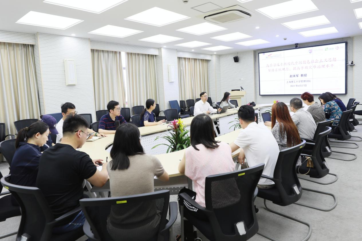 To thoroughly implement the important directive spirit of "Enhancing Public Safety Governance and Improving the Social Governance System" in the report of the 20th CPC National Congress, the Department of Public Administration recently carried out a thematic education Party lecture in the Conference Room 506, Economic Management Building A.Prof. Zhao Laijun, dean and deputy secretary of the Party Committee of Business School, was invited to give a special Party lecture entitled "Holding High the Great Banner of Xi Jinping Thought on Socialism with Chinese Characteristics for a New Era, Adhering to the Systems Thinking, and Improving the Level of Disasters Governance".Members of the Party branch of the Department of Public Administration and some teachers of the Department of Systems Science participated in the Party lecture.