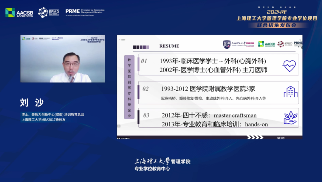 Zhang Zheng systematically summarised the overall situation of USST, Business School and the MBA program from the aspects of university education history, school history, organisational structure, faculty strength, discipline construction, etc. He said that the MBA program at USST has a long history. In 2018, Business School passed the AACSB certification and entered the ranks of world-class Business Schools. The MBA program of USST focused on creating three characteristic directions: medical device management, innovation and entrepreneurship management and artificial intelligence management, to cultivate and expand students' innovative thinking and international vision to better meet the needs of management talents in Shanghai and the whole country in the new era. The program is equipped with faculty strength with a relevant background in strategic emerging industries, and famous corporate executives are hired as joint training supervisors. This program implements a double tutorial system, small-class teaching, and 2 years of schooling. The school also has a generous scholarship policy for MBA students.