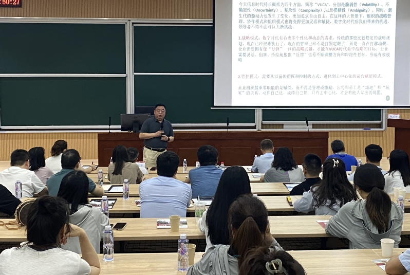 Ge Yuhui, head of the Department of Business Administration and executive deputy director of the EDP Center, gave a lecture on "Leadership Reshaping and Promoting in the Digital Age" based on the characteristics of the digital age. He said that the digital age showed the characteristics of "vulnerability, uncertainty, complexity, ambiguity"; the driving force of the new generation had become more free and autonomous, resulting in many changes in the enterprise management model, the organisation's strategic management, collaboration model and organisational model would become more flexible and agile, the digital age not only brought us huge opportunities but also presented new challenges for leaders.