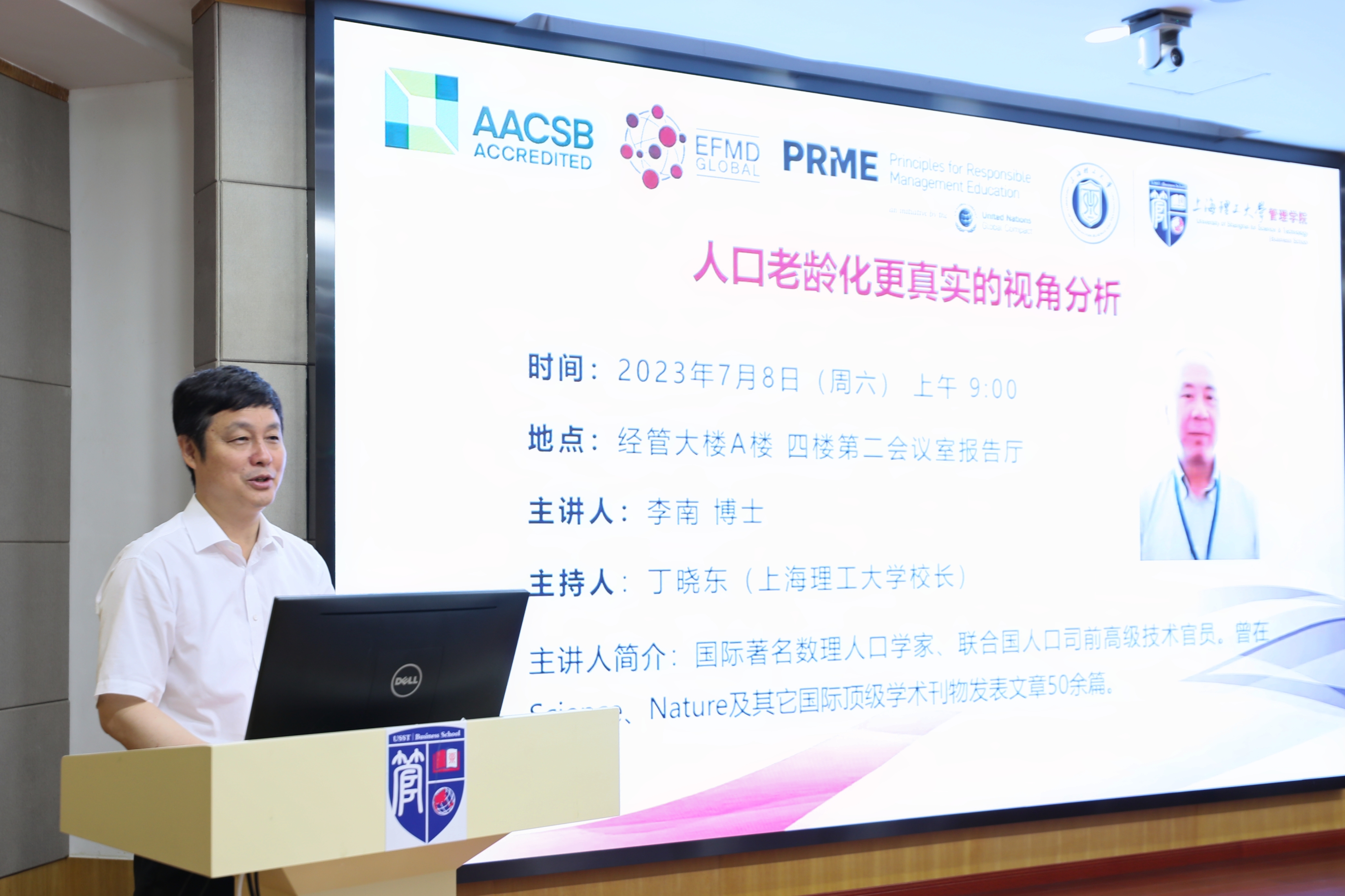 On 8th July 2023, our school invited Dr. Li Nan, an internationally renowned demographer and former senior technical officer of the United Nations Population Division, to give an academic report entitled "A More Realistic Perspective on Population Aging". Teachers and students of related disciplines of our school and outstanding summer camp students of public management discipline of Business School attended the seminar. The seminar was presided over by president Ding Xiaodong.