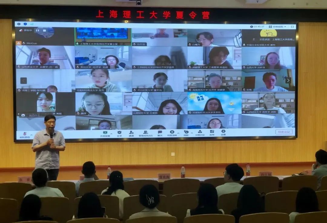 On July 8th, 2023, our school's Department of Applied Economics held The 2023 Summer Camp for National Outstanding Undergraduate Students. More than 70 outstanding undergraduate students from 34 universities, including the University of Chinese Academy of Social Sciences, Jiangxi University of Finance and Economics, Anhui University of Finance and Economics, Henan University of Finance and Law, Shanxi University of Finance and Economics, Yunnan University of Finance and Economics, etc., participated in the summer camp by combining online and offline activities. Zhao Jing, vice dean, Lei Lianghai, the leader of Applied Economics Discipline, and Tian Fa, Duan Jiangjiao, Zhang Qing, and Guo Wei, teacher representatives of Business School, also attended the activities, which was presided over by Zhang Qing.
