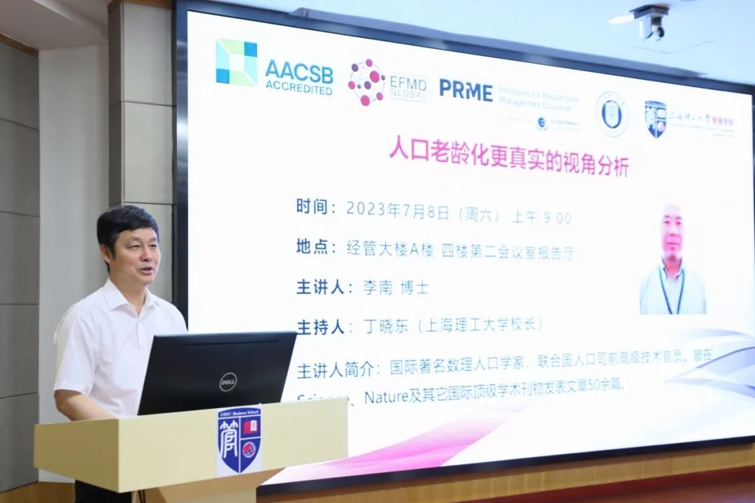 After the opening ceremony, Dr Li Nan, an internationally renowned mathematical demographer and former senior technical officer of the United Nations Population Division, and Liu Xinping, associate Prof. of the Department of Public Administration, brought two wonderful academic reports, "A More Realistic Perspective on Population Aging" and "Digital Transformation and Modernization of Urban Governance" to all teachers and students respectively. Dr Li Nan's report was presided over by Ding Xiaodong, president of USST.