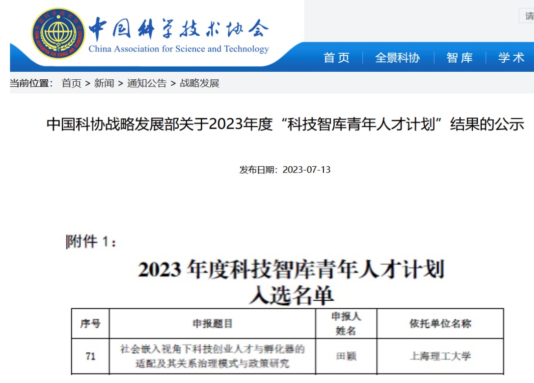 Recently, the China Association for Science and Technology (CAST) announced the results of the "2023 Science and Technology Think Tank Young Talent Plan", in which 120 consulting projects were selected for approval among a large number of competitors by CAST's expert and comprehensive evaluation. The project adaptation of science and technology entrepreneurial talents and incubators and its relationship governance model and policy research from the perspective of social embeddedness hosted by Tian Ying, a faculty member of our school, obtained approval.
