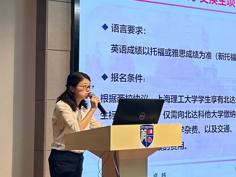 Wei Xin, staff of the International Office of USSTBS, introduced the exchange programs of Business School, such as the double degree program with Brest Business School in France and the exchange program with the University of North Dakota in the US.