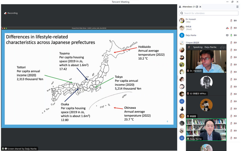 As the 77th event of the Academic series of Hujiang Economy and Management symposium of Business School on December 1st, Professor Narita Daiju, an environmental economist from the University of Tokyo, presented a lecture titled“Which Japanese prefectures are greenest? Insights from Input-output analysis (I-O)”in the English language. The event was hosted by Dr. Hareesh from university of shanghai for science and technology in Tencent meeting: 629 289 691. Due to a high participation demand from students and colleagues, the lecture was recorded to upload to the school system for playback.