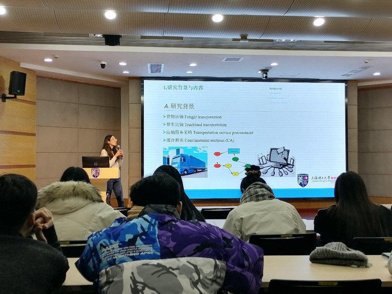 On December 19, the 80th Event of Academic Series of "Hujiang Economy and Management Symposium" was held in the Lecture Hall on the 4th floor of Building A of the Business School. Lyu Ke, a lecturer of the Department of Industrial Engineering, gave an academic report entitled Combinatorial Auctions in Transportation Service Procurement. This report attracted more than 40 participants.