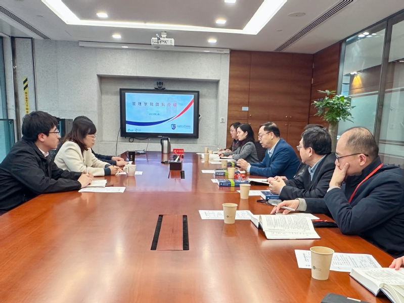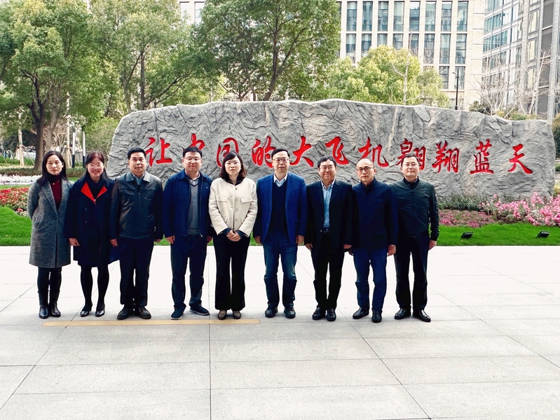 On March 26, Zhao Laijun, dean of USSTBS, together with Liu Qinming, director of the Department of Industrial Engineering, Geng Xiuli, secretary of the Party Branch of the Department of Industrial Engineering, Fan Chongjun, director of the Department of Information Management and Information Systems, Zhu Xiaodong, secretary of Party Branch of the Department of Information Management and Information Systems, and representatives of faculty members, including Prof. Liu Bin, Associate Prof. Liu Yong and Associate Prof. Ni Jing, visited the headquarters of Commercial Aircraft Corporation of China, Ltd. (COMAC) to carry out exchanges. Zhang Chao, director of System Engineering & Program Management Department of COMAC, Fang Feng, senior program director, and Dong Zhe, program director expressed their warm welcome to the delegation of the Business School.