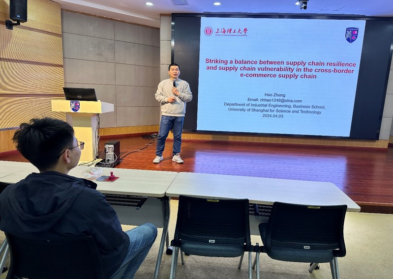 On April 3rd, the Hujiang Economics and Management Forum Series (95th Session) was successfully held at the Lecture Hall on the fourth floor of Building A of the Business School. The event featured a scholarly presentation titled “Striking a balance between resilience and vulnerability in the cross-border e-commerce supply chain” delivered by Hao Zhang, a lecturer of the Department of Industrial Engineering. More than 30 teachers and students from relevant disciplines of the Business School participated in this report.