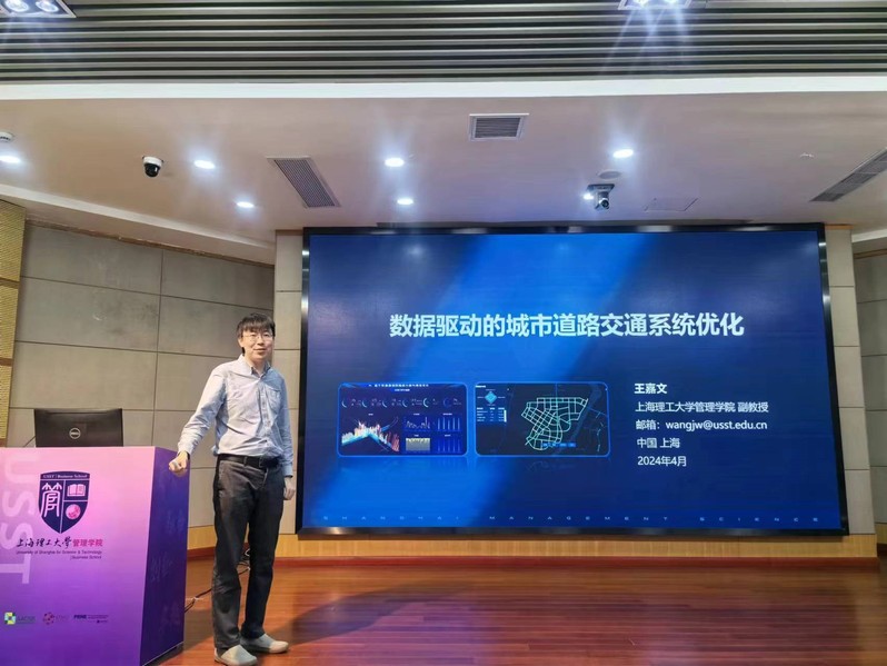 On April 24th, the 100th edition of The Hujiang Economics and Management Forum Series was held at the Lecture Hall on the fourth floor of Building A of the Business School. Associate Professor Wang Jiawen from the Department of Transportation System Engineering delivered an academic report titled Data-Driven Optimization of Urban Road Traffic Systems.