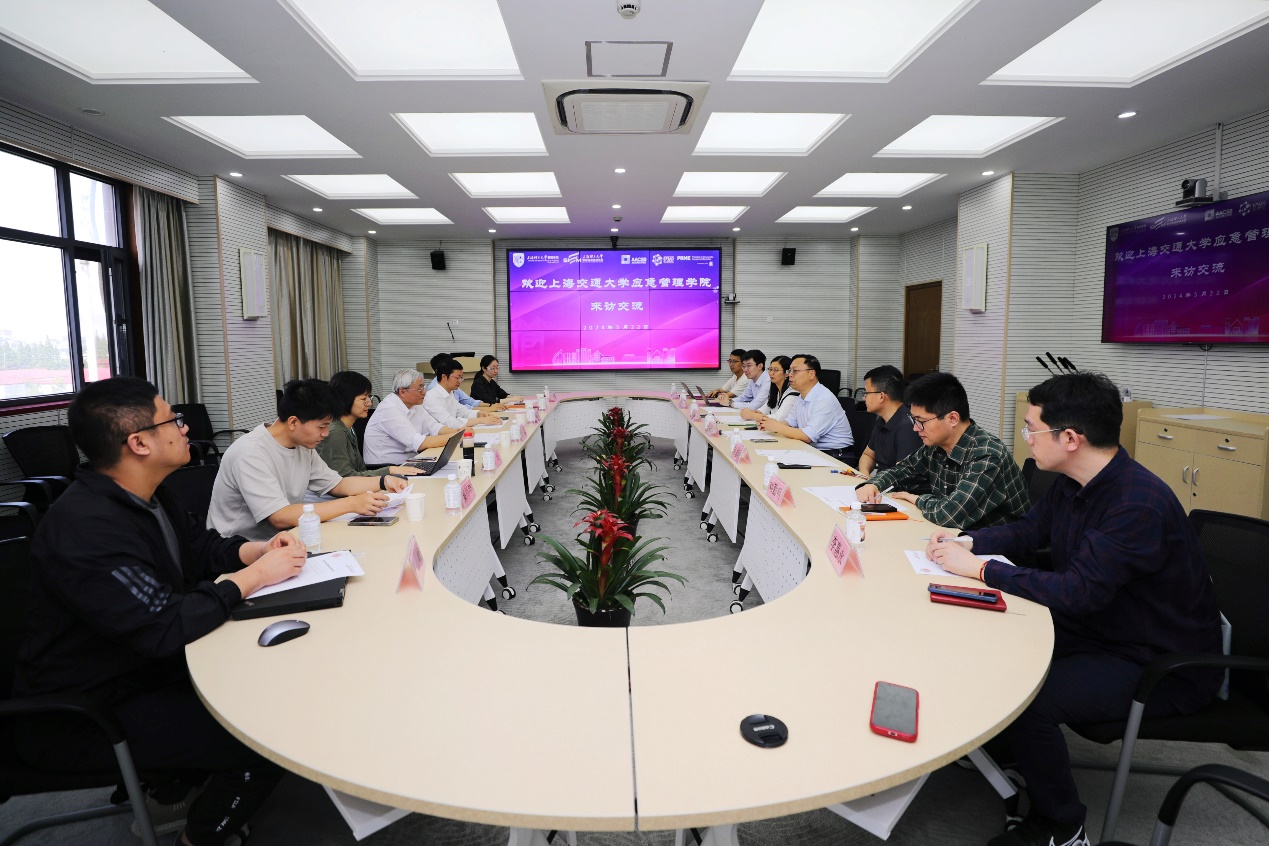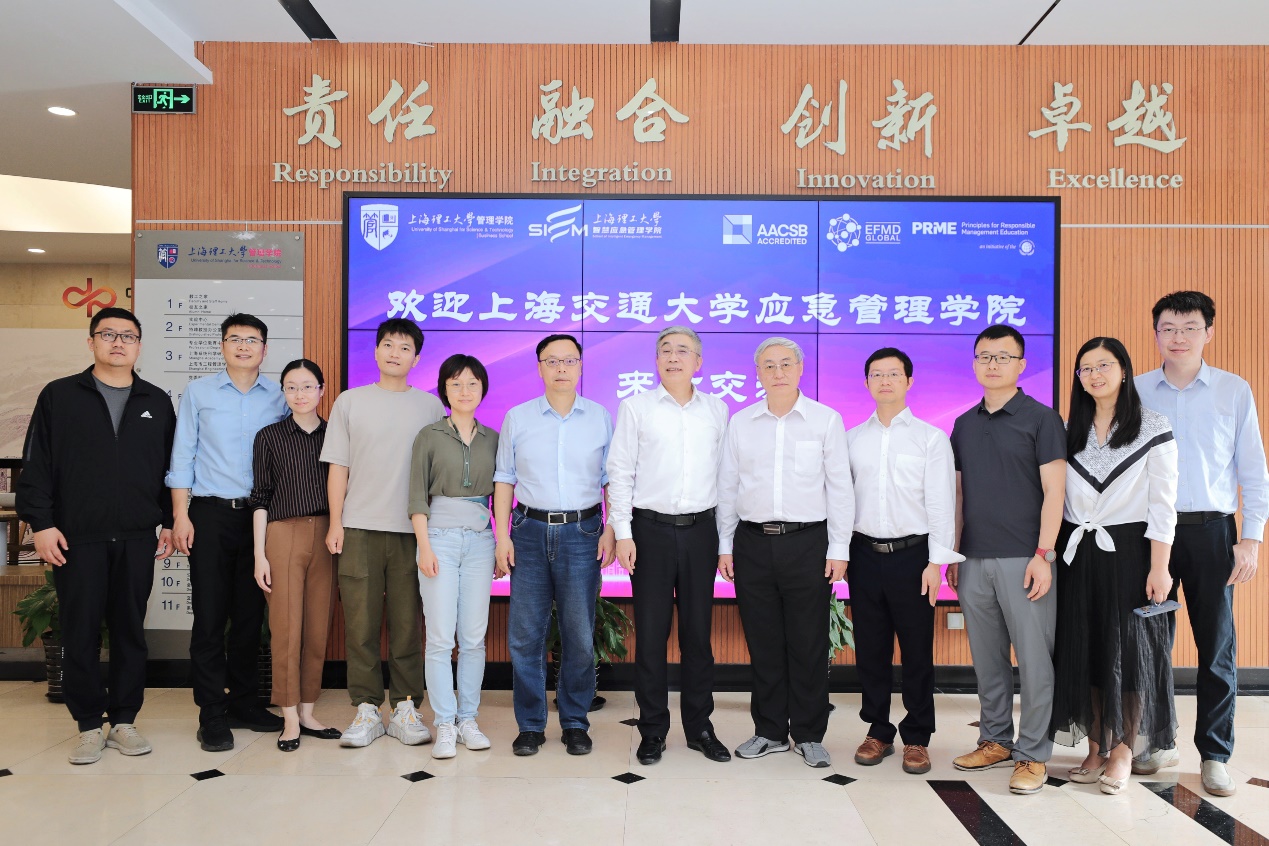 On the afternoon of May 22, Wu Dan, former vice president of Shanghai Jiao Tong University (SJTU), vice president of China Society of Emergency Management, and specially appointed professor of the SJTU School of Emergency Management (SJTU-SOEM), led a delegation to visit the USSTBS. Zhao Laijun, dean of USSTBS and executive dean of the USST School of Intelligent Emergency Management (USST-SIEM), welcomed the delegation and participated in the exchange meeting.