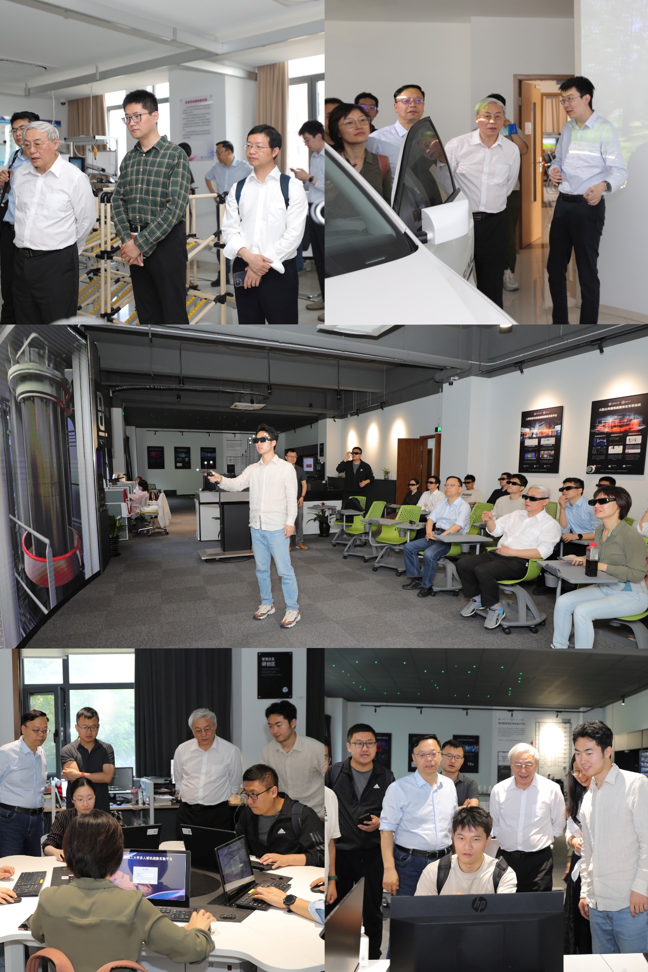 Following the meeting, Wu Dan and the delegation visited the VR interactive devices and experimental platforms of the USST-SIEM Laboratory. They experienced the experimental platforms for crowd evacuation during emergencies, intelligent emergency transportation, resilience of complex systems, and intelligent safety production.