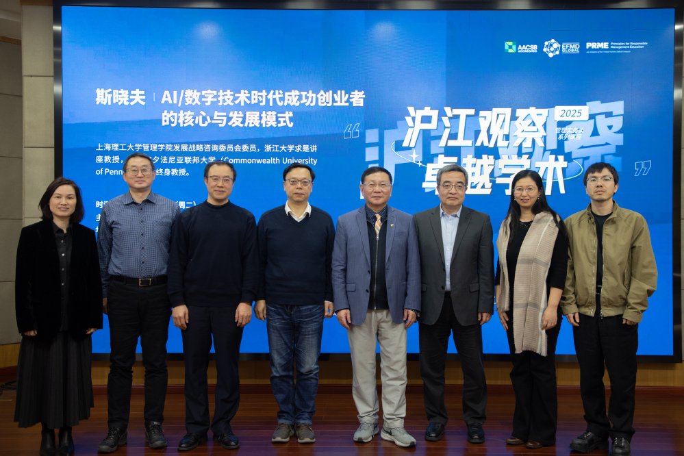On January 14, the “Hujiang Observation” outstanding academic course was held at the Jungong Road Campus. Si Xiaofu, a member of the Development Strategy Advisory Committee(DSAC) of the Business School, a Qiushi Chair Professor at Zhejiang University, and a tenured professor at University of Pennsylvania, delivered a keynote lecture titled “Core Elements and Development Models of Successful Entrepreneurs in the AI/Digital Technology Era”. The lecture was presided over by Zhao Laijun, the dean of the School and the director of Professional Degree Education Center(PDEC). Zhang Zheng, the deputy dean and deputy director of PDEC, Meng Chenli, the director of PDEC Comprehensive Office, as well as faculty members and students attended the lecture.