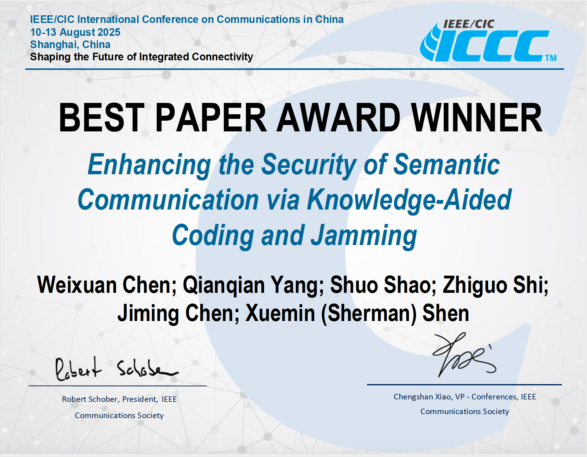 At the recently concluded IEEE/CIC International Conference on Communications in China (ICCC) 2025, a paper co-authored by Associate Professor Shao Shuo from the Business School of USST and collaborators was awarded the Best Paper Award alongside ten other papers, standing out among 1091 global submissions.