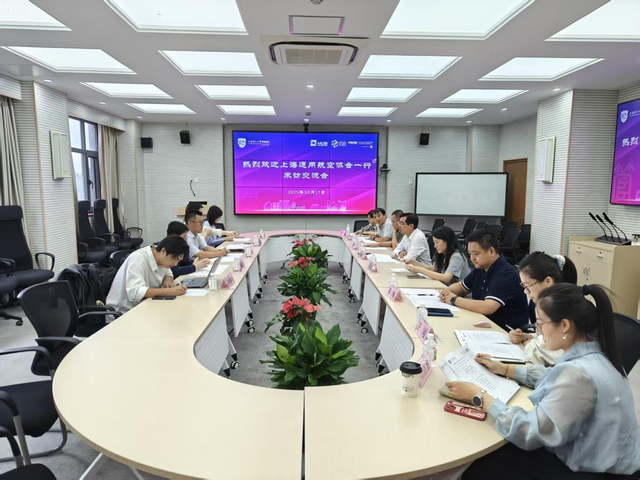 On October 17, Ding Jie, Director of the Education and Training Committee of the Shanghai General Aviation Association (SGAA), and Lin Yuqing, HR Manager of Shanghai Hongqiao International Import Commodities Co., Ltd., visited the Business School. Liu Weiwei, Vice Dean of the School and Director of the Department of Transportation System Engineering, warmly received the delegation. Attendees included Xu Jing (Graduate Academic Affairs Office), faculty members from the Department of Transportation System Engineering (Yuan Pengcheng, Liang Shidong, Chen Qian), the Department of Artificial Intelligence (Wang Ke, Liu Xiaohui), and Wu Zikai from the Department of Systems Science. The meeting was presized over by Liu Weiwei.